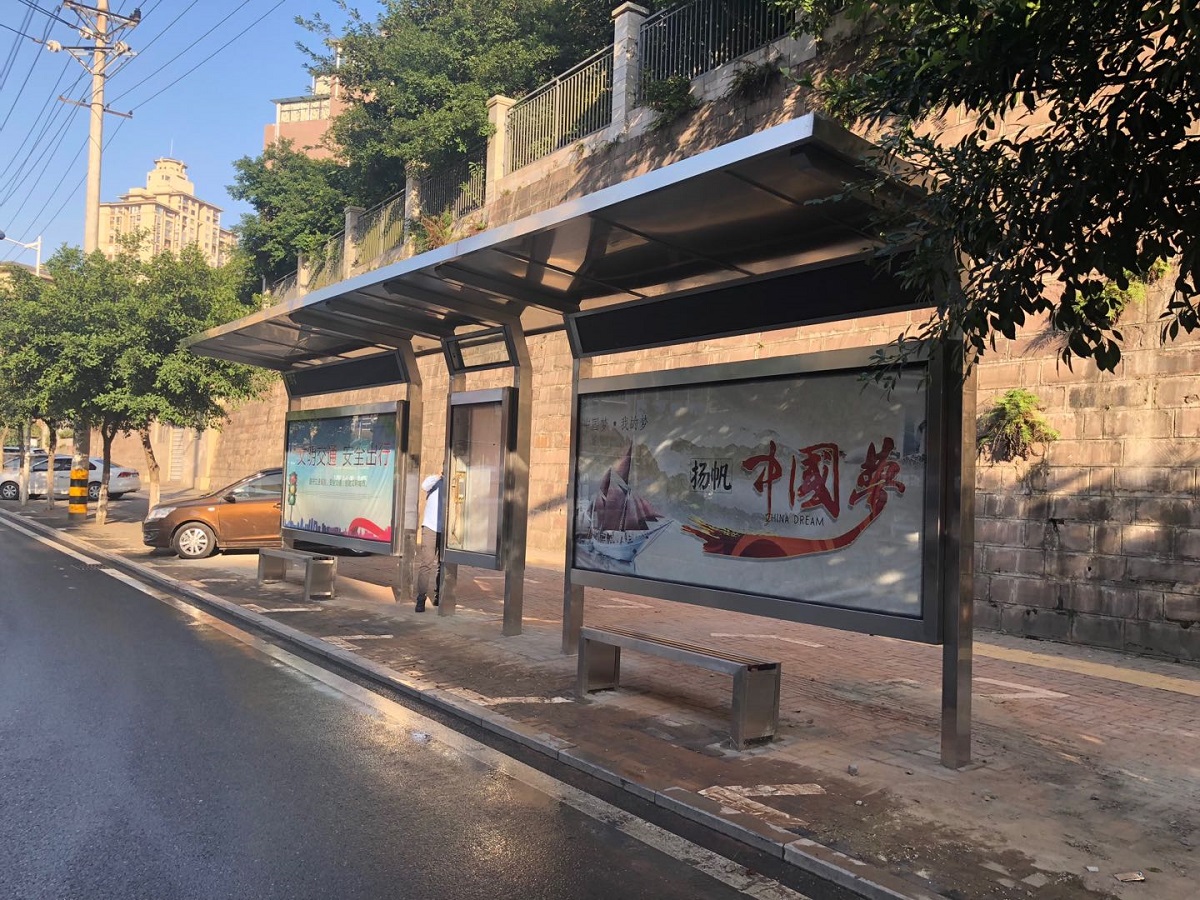 二、四車道站棚:一字式2+1結(jié)構(gòu),功能設(shè)置有線路牌、充電盒、LED顯示屏、滾動(dòng)系統(tǒng)和座凳。